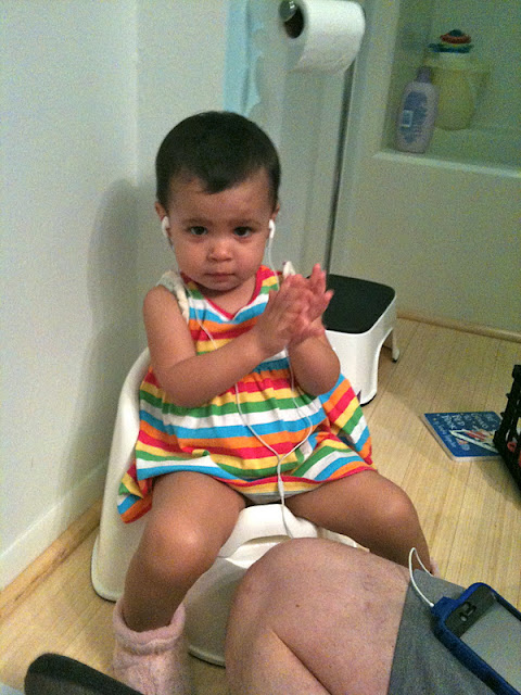 At two years, she's self-sufficient and independent. She doesn't normally narrate her potty breaks, but I guess since daddy was filming...she added comments for interest;).